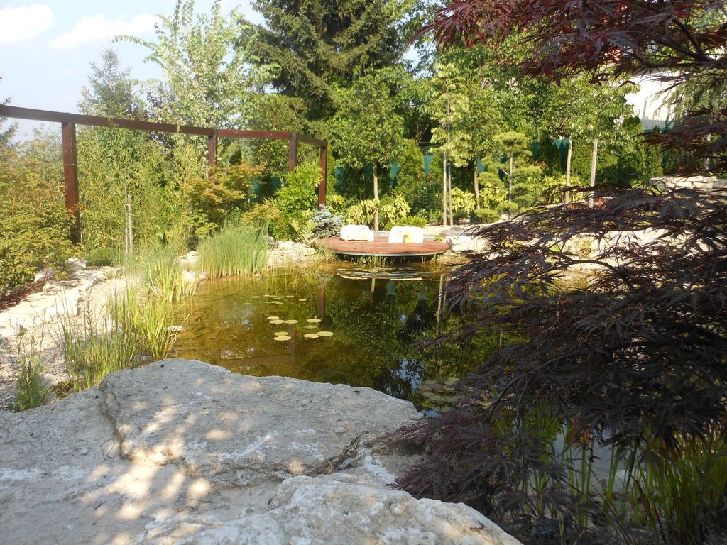 A meglévő kert alapjaiban jó volt, de mivel a kert igen nagy alapterülettel rendelkezik és amúgy is fejlesztések előtt állt (lőtt beton medence bővítés, trópusi nyaralásra emlékeztető pavilon építése, tó környezete...) átterveztük melynek fő szempontjai a különböző funkciójú terek egymástól való elhatárolása és egy egy adott kertrészlet sajátos hangulatának megteremtése.