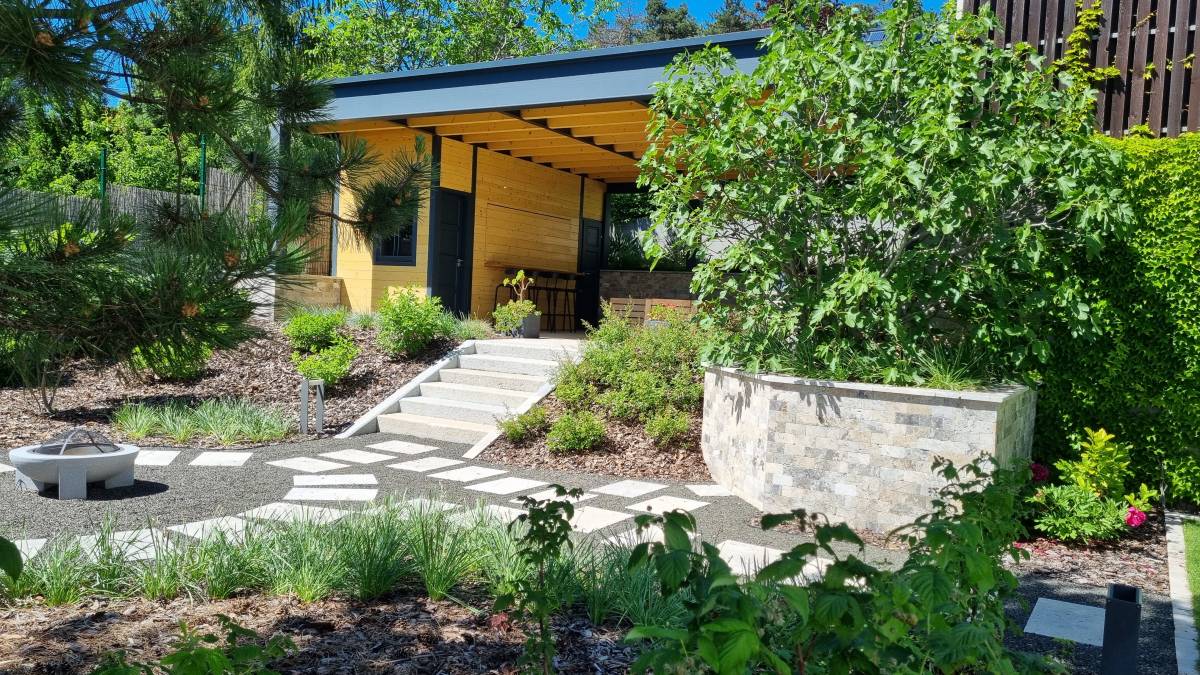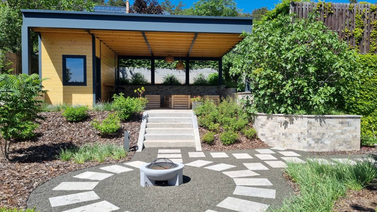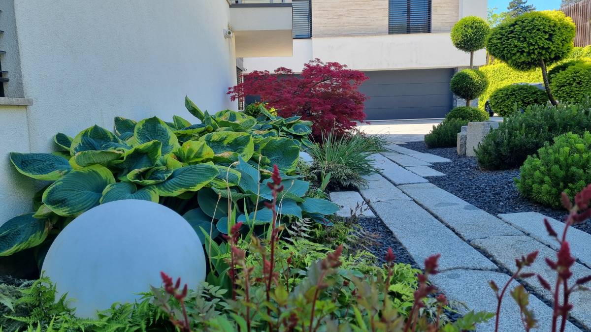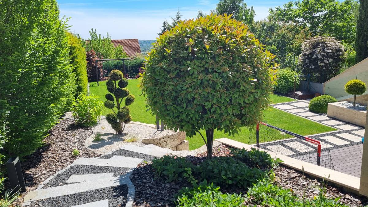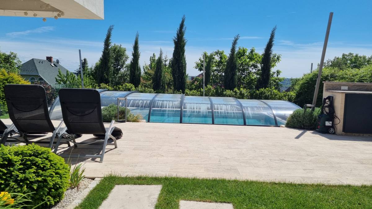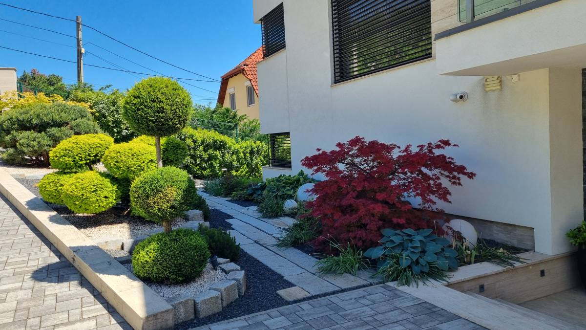 A budaörsi dombokba illesztett letisztult, modern házat épített jellegű zöld környezete jól kihangsúlyozza. A kert is több szinten került kialakításra. a teraszhoz közel kapott helyet a kilátással, panorámával rendelkező medence, az alsó terepszinten a gyerekek játszóhelye és az egybefüggő szaladgálós pázsitfelület, a fenti bejárat mellett pedig egy keleties, japános hatású gránit tömbökből vezető kerti úton lehet megközelíteni a kertet.