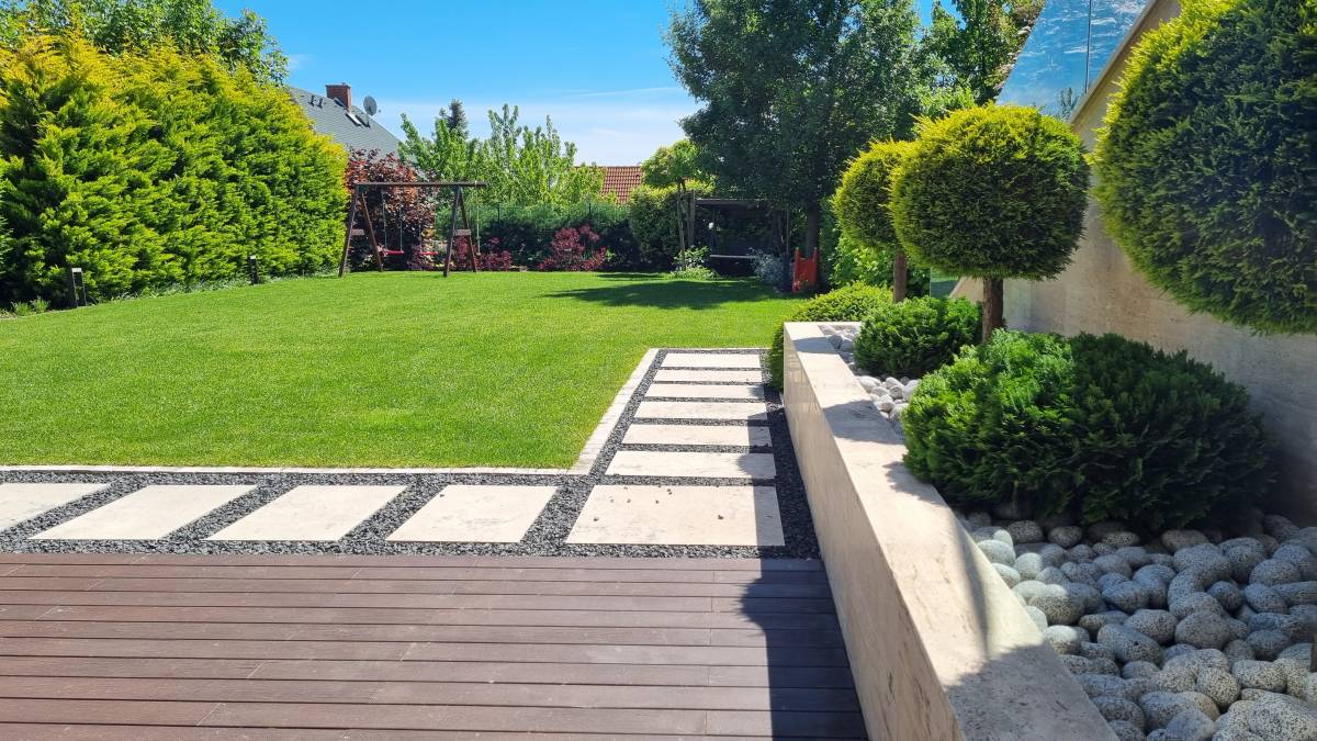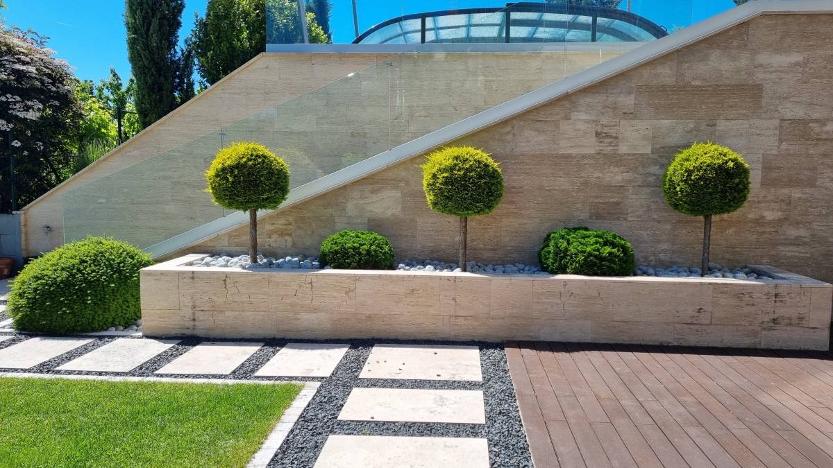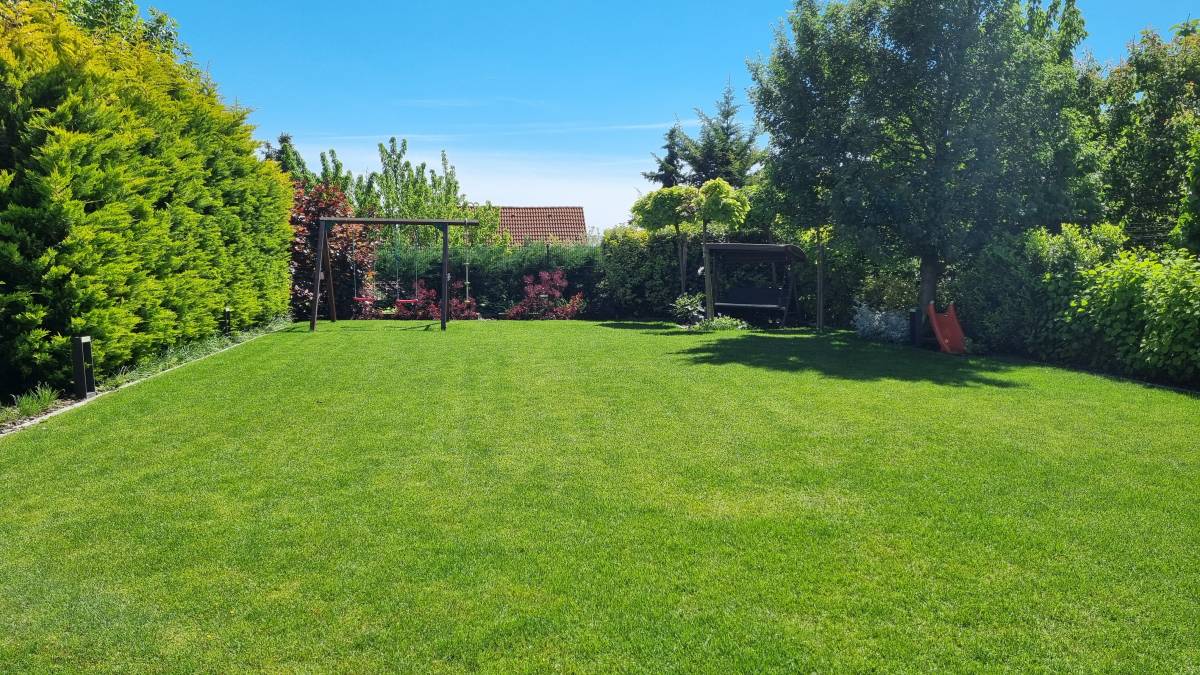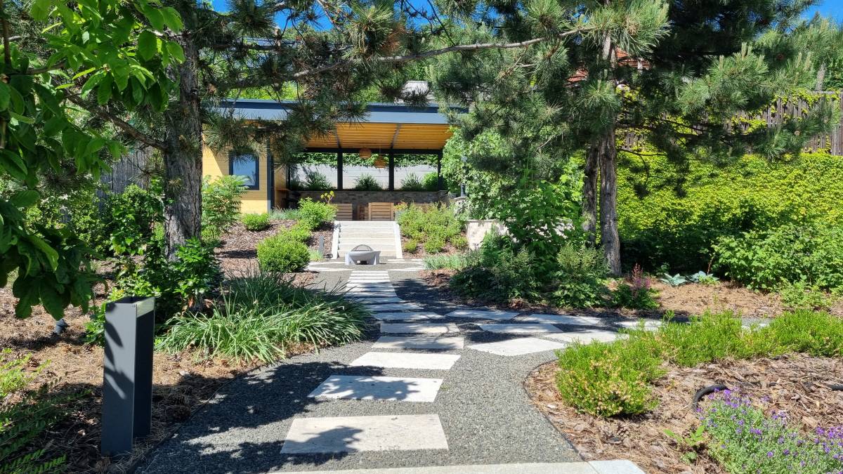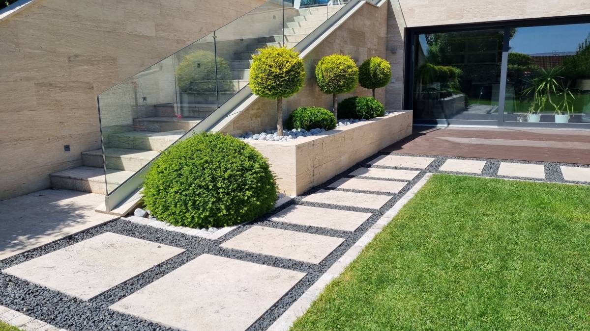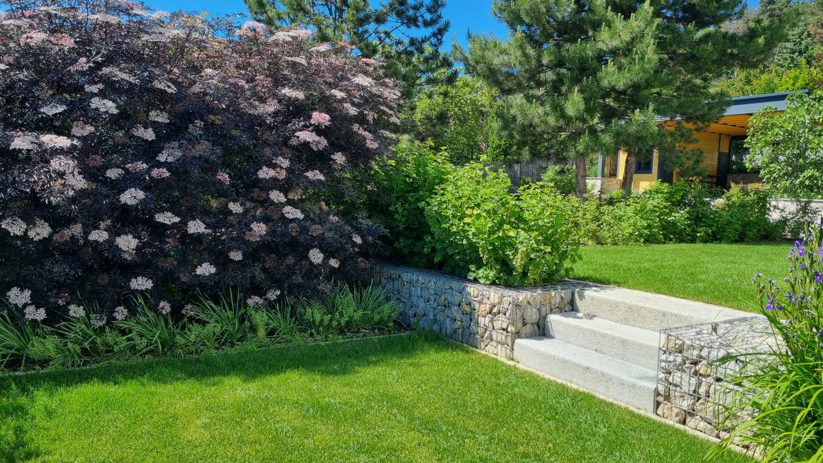 A budaörsi dombokba illesztett letisztult, modern házat épített jellegű zöld környezete jól kihangsúlyozza. A kert is több szinten került kialakításra. a teraszhoz közel kapott helyet a kilátással, panorámával rendelkező medence, az alsó terepszinten a gyerekek játszóhelye és az egybefüggő szaladgálós pázsitfelület, a fenti bejárat mellett pedig egy keleties, japános hatású gránit tömbökből vezető kerti úton lehet megközelíteni a kertet.